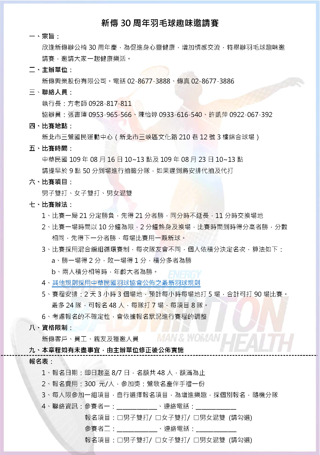 欣逢新傳辦公椅30周年慶,為促進身心靈健康,增加情感交流,特舉辦羽毛球趣味邀請賽,邀請大家一起健康樂活。