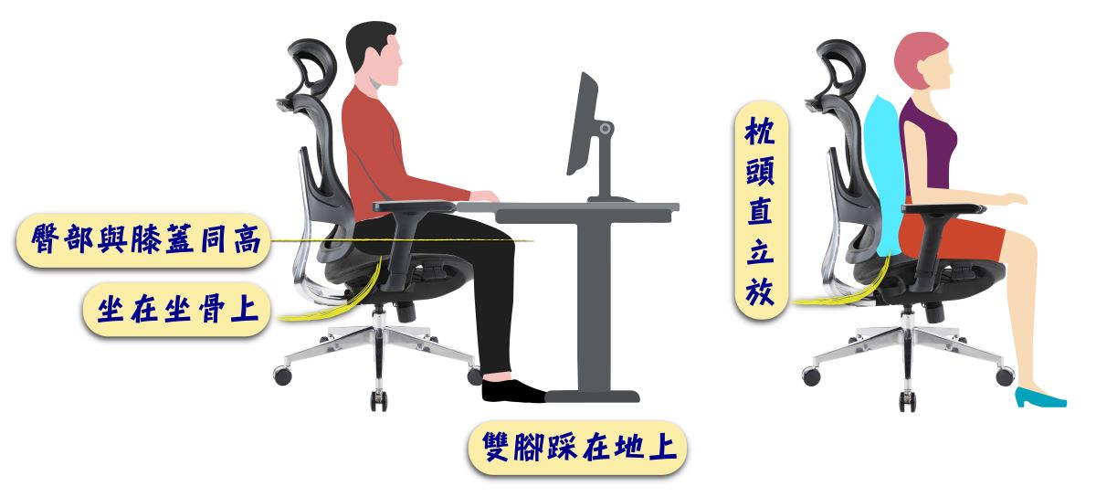 不良的坐姿容易造成腰痠,嚴重時甚至會導致椎間盤突出,而出現腿酸腳麻的症狀。腰椎因長期彎腰壓迫而導致椎間盤突出;當突出部位壓迫到神經時就會引起腰痠、腿痠或腳麻。所以坐姿應避免彎腰駝背、避免身體側靠一邊。良好的坐姿應該坐在坐骨上;雙腳踩在地板上;臀部與膝蓋同高。