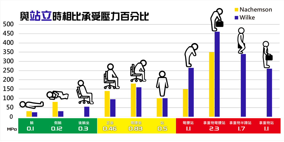 | Nachemson等人(1964)與Wilke等人(1999)對椎間盤壓力測量值的比較。條形下方顯示的壓力值來自較新的測量值。靠背傾斜的放鬆坐姿,上半身的部分重量由靠背支撐,因此與腰椎間盤壓力的顯著降低有關。 |